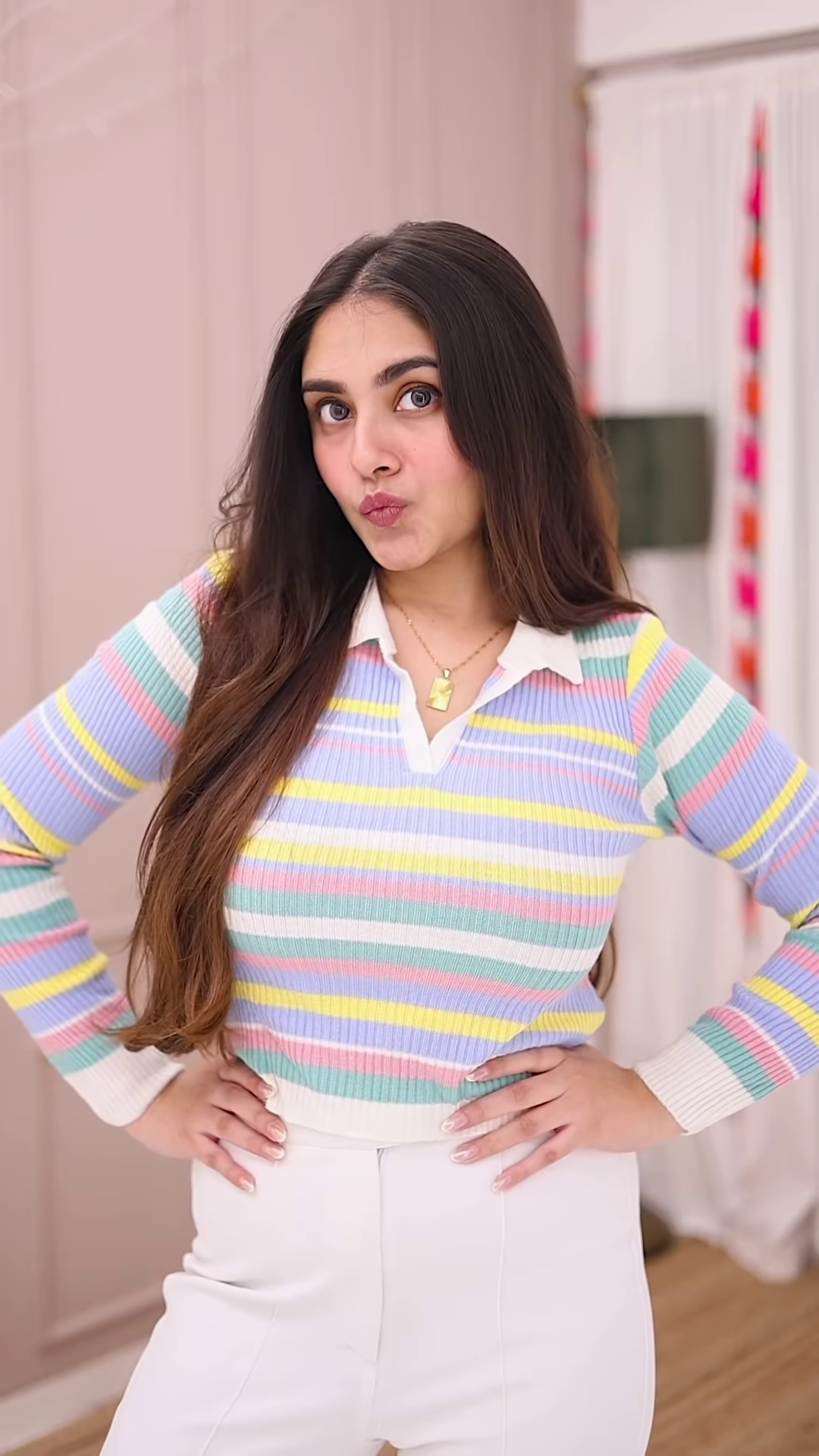 - 🌈 Striped Sweater: Horizontal pastel stripes in blue, yellow, pink, and green with white collar; paired with white pants and gold pendant