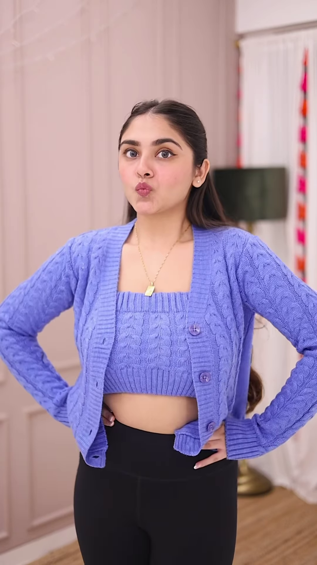 - 🧶 Cable-Knit Co-Ord: Matching blue cardigan and crop top with button detailing; paired with black high-waisted pants