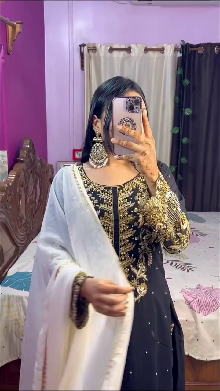 This outfit is a perfect example of timeless ethnic fashion. The georgette fabric is breathable and lightweight, making it comfortable for long hours of wear. The heavy thread-work is executed with precision, ensuring a high-quality finish and durability. Style this set with cream or gold-toned jewelry and high heels to accentuate the elegant color combination. The embroidery is designed to be multi-dimensional, with different stitch thicknesses used to create depth and texture across the floral designs.
