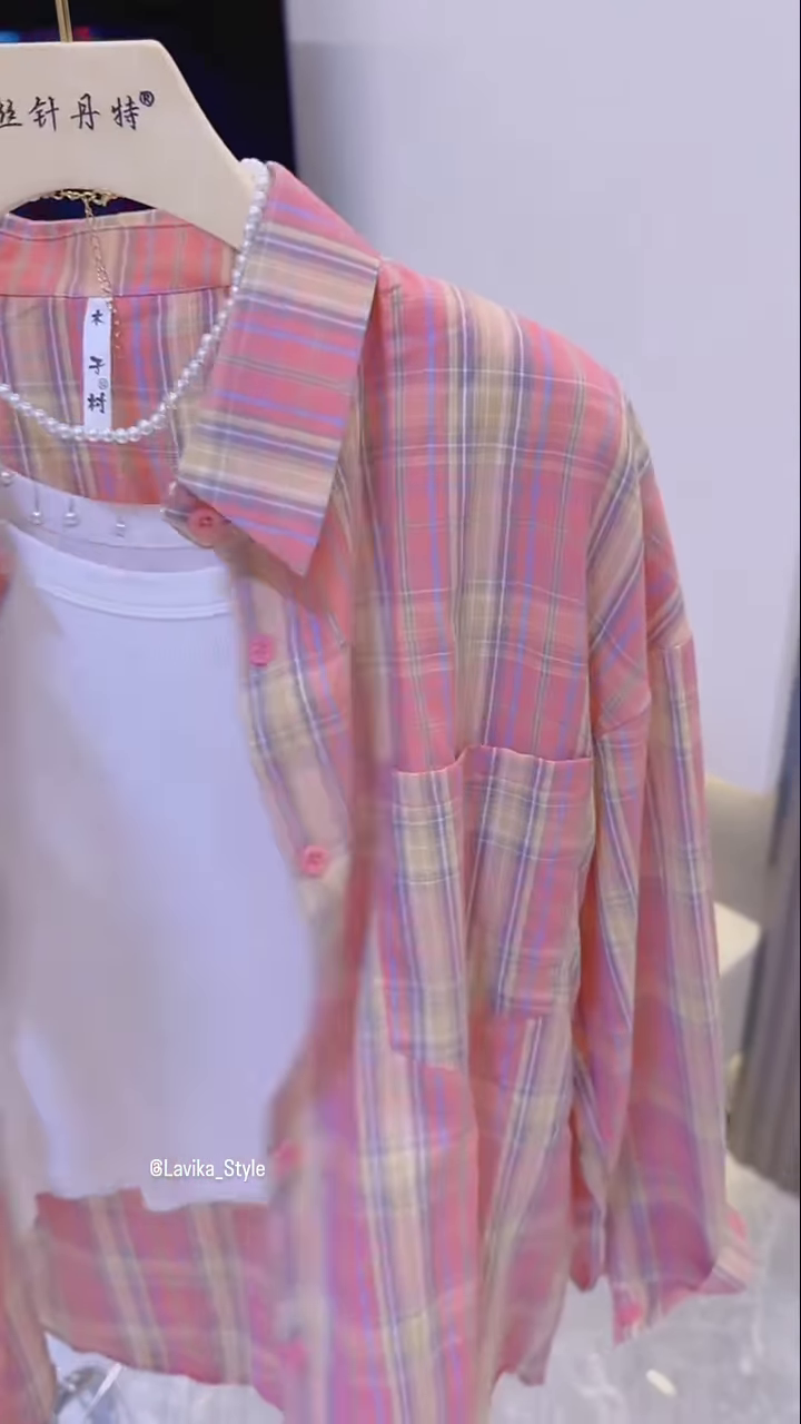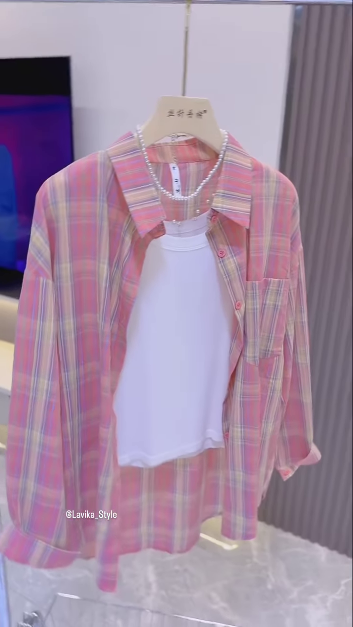 The inner top is a simple, solid white tank or camisole, which provides a clean and crisp base for the colorful plaid shirt. The contrast between the plain white and the patterned pink creates a balanced and visually pleasing aesthetic. The simplicity of the inner top allows the plaid shirt to be the main focus of the outfit while ensuring the overall look remains uncluttered and chic. This inner top is also a versatile staple that can be worn with other pieces in your wardrobe.