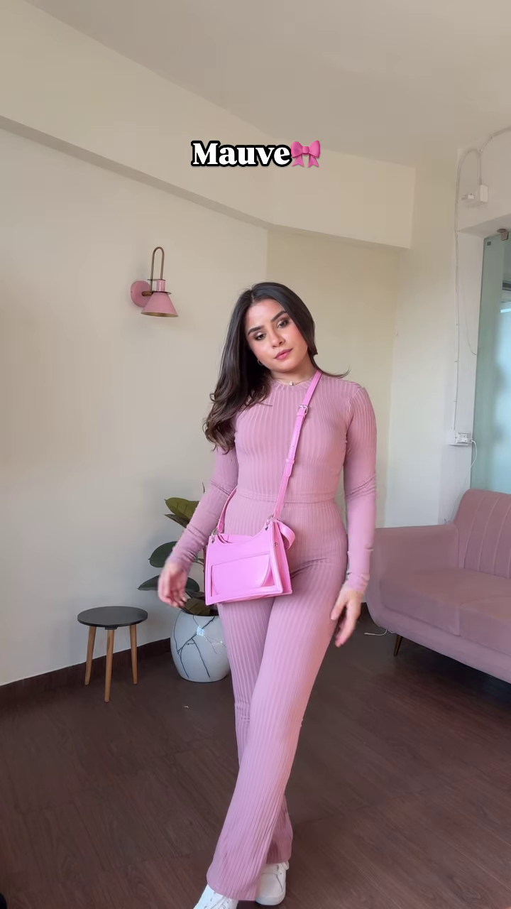 This chic teal ribbed knit co-ord set with its cropped turtleneck top and wide-leg pants is a fashionable and comfortable choice for various occasions. The vibrant teal color makes a statement, while the ribbed knit adds texture and coziness. The addition of the bright pink crossbody bag introduces a playful and trendy contrast, making this ensemble a stylish and eye-catching look.
