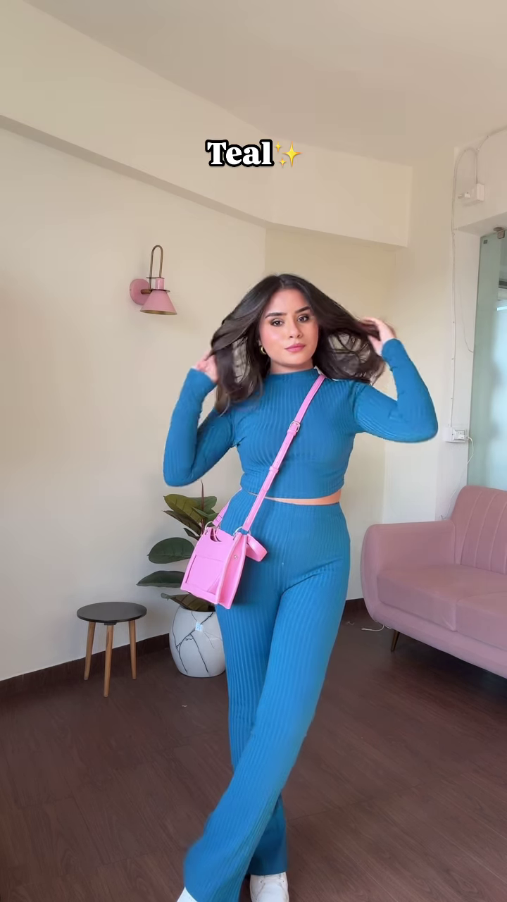 + Free Shippingstylish and comfortable women’s co-ord set in a vibrant teal color. The set features a cropped turtleneck long-sleeved top and matching high-waisted wide-leg pants, both crafted from a ribbed knit fabric. The outfit exudes a trendy yet relaxed vibe, perfect for casual outings or lounging in style. A bright pink crossbody bag adds a playful pop of color to the monochromatic ensemble.