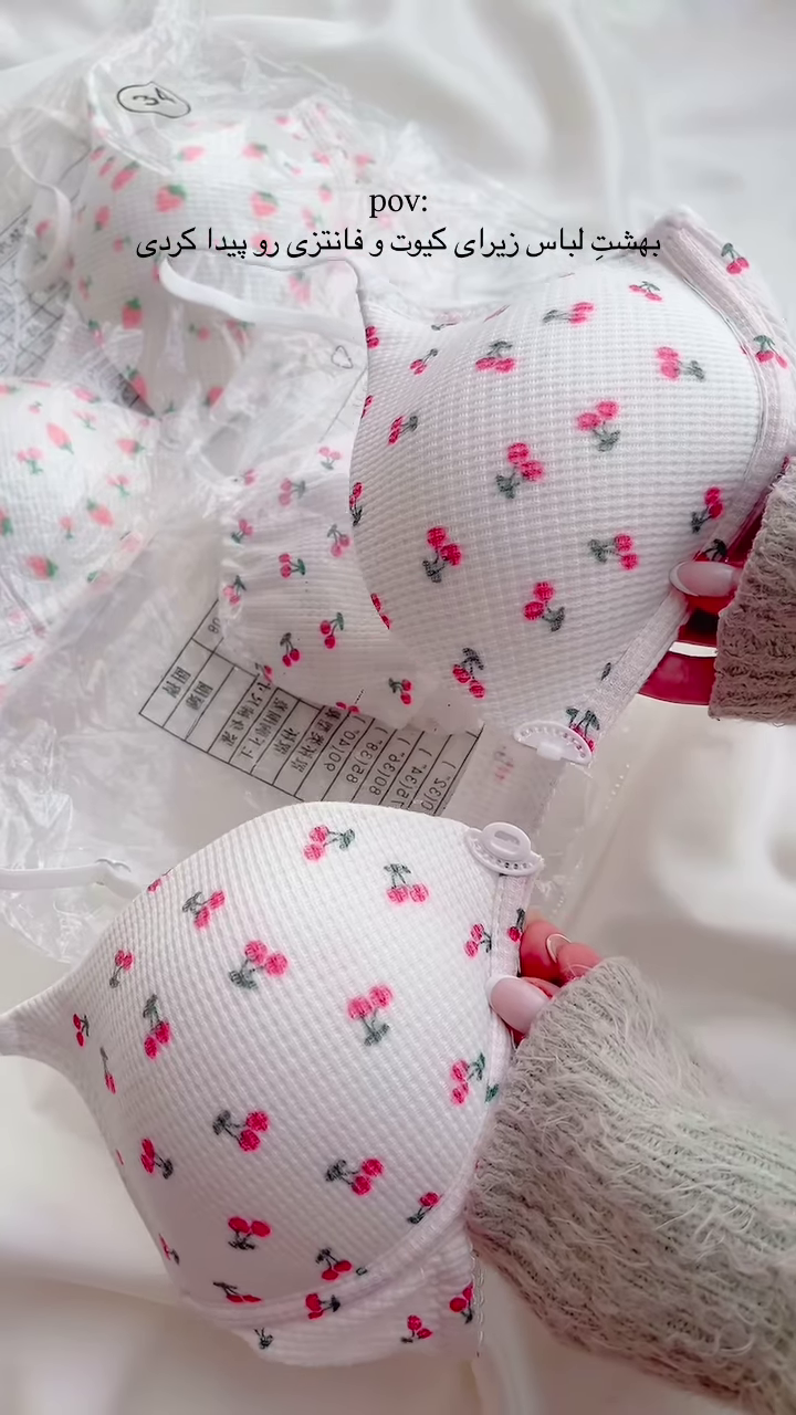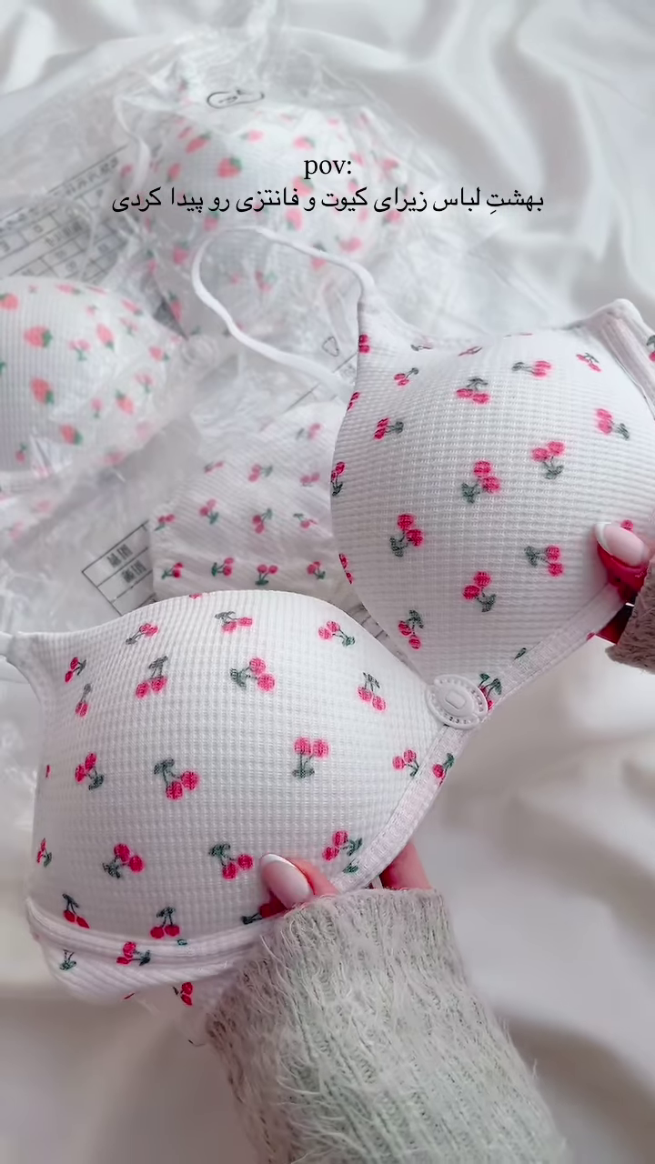 The bra is designed to offer gentle support and a comfortable fit. Crafted from a soft white ribbed fabric, it provides a subtle texture that feels pleasant against the skin, especially in Ahmedabad’s climate. The bra likely features a wireless design for natural shaping and all-day comfort, or a soft underwire for gentle support. The cups are adorned with a charming pink cherry print, scattered playfully across the white base. The straps are typically adjustable for a personalized fit, and the closure at the back ensures secure wear. Delicate details like a small bow or picot trim may further enhance its cute appeal.