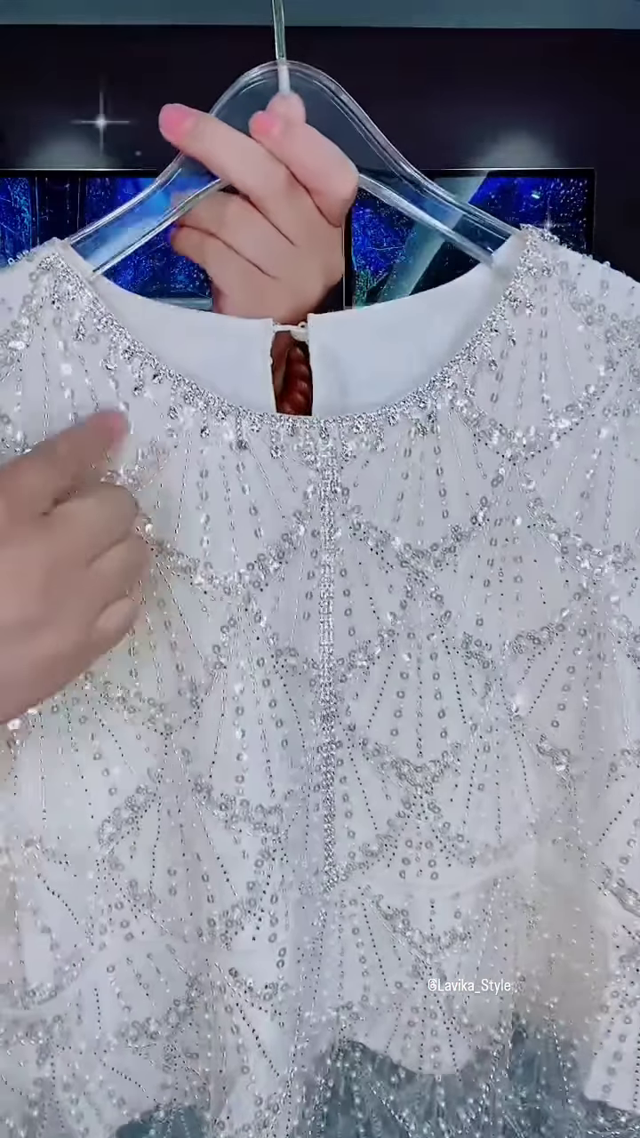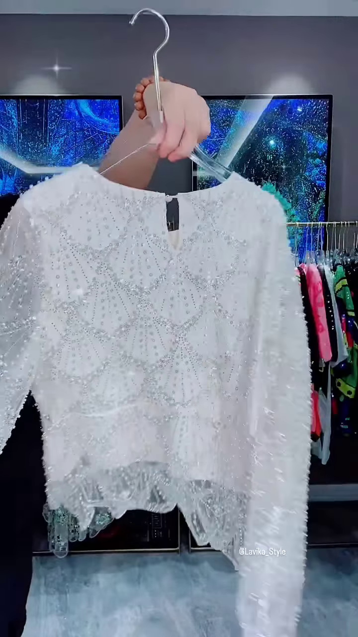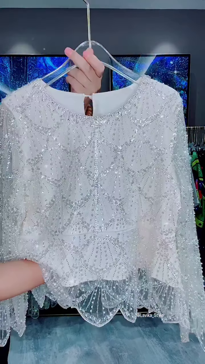 This exquisite white top is a true showstopper, designed for those who want to make a brilliant and elegant statement. It’s a perfect piece for formal events, parties, or any occasion where you want to shine. The intricate combination of sequins and beads, along with a unique silhouette, makes this top a memorable and luxurious addition to your wardrobe.