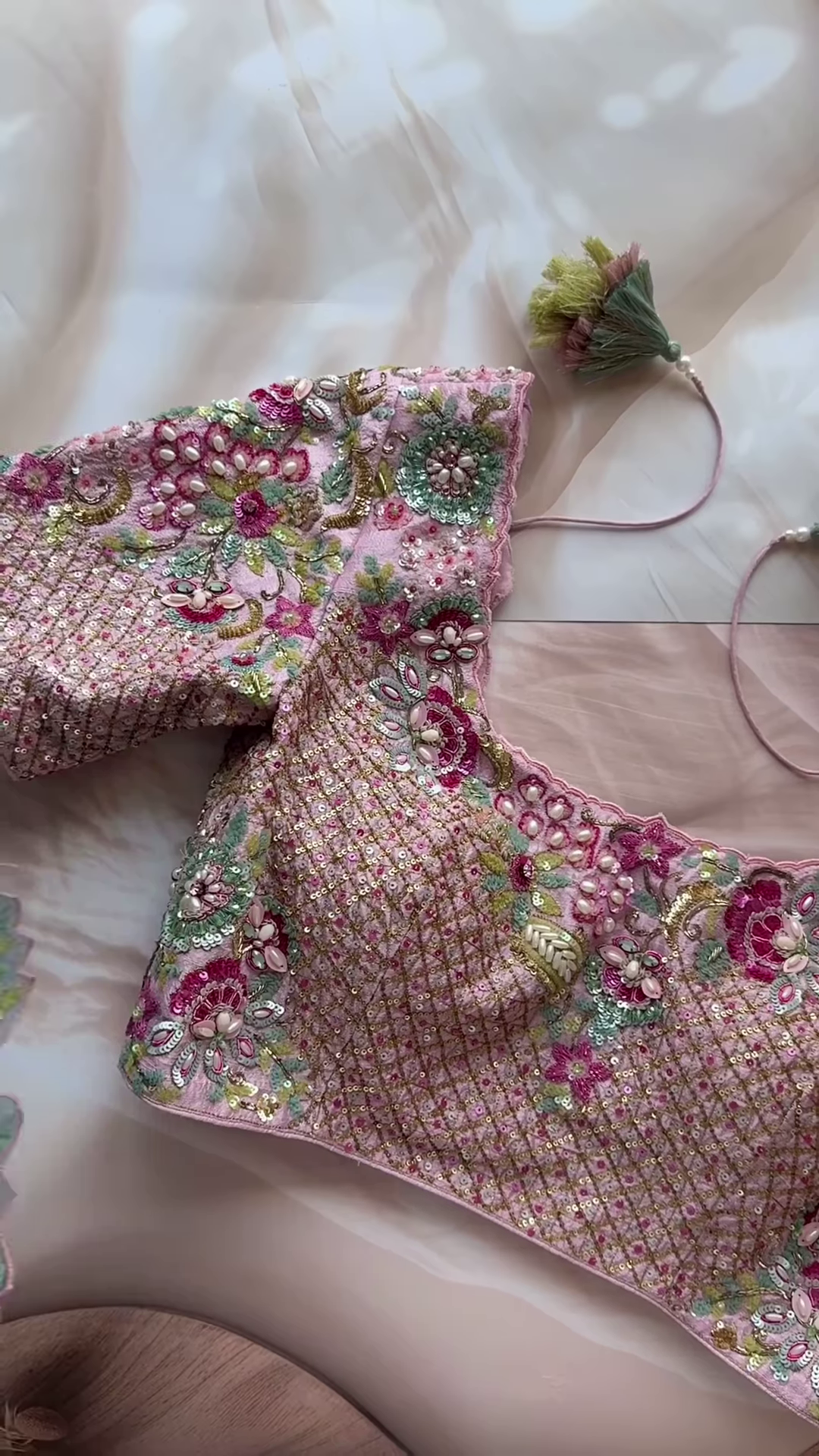 On the right, a blush pink segment introduces a grid-style lattice embroidered backdrop that sparkles under light due to embedded sequins. Each square within the lattice holds pink and gold floral accents, providing symmetrical balance and design depth. The bead detailing adds texture while enhancing the festive tone, making it suitable for bridal overlays or statement kurti fronts.