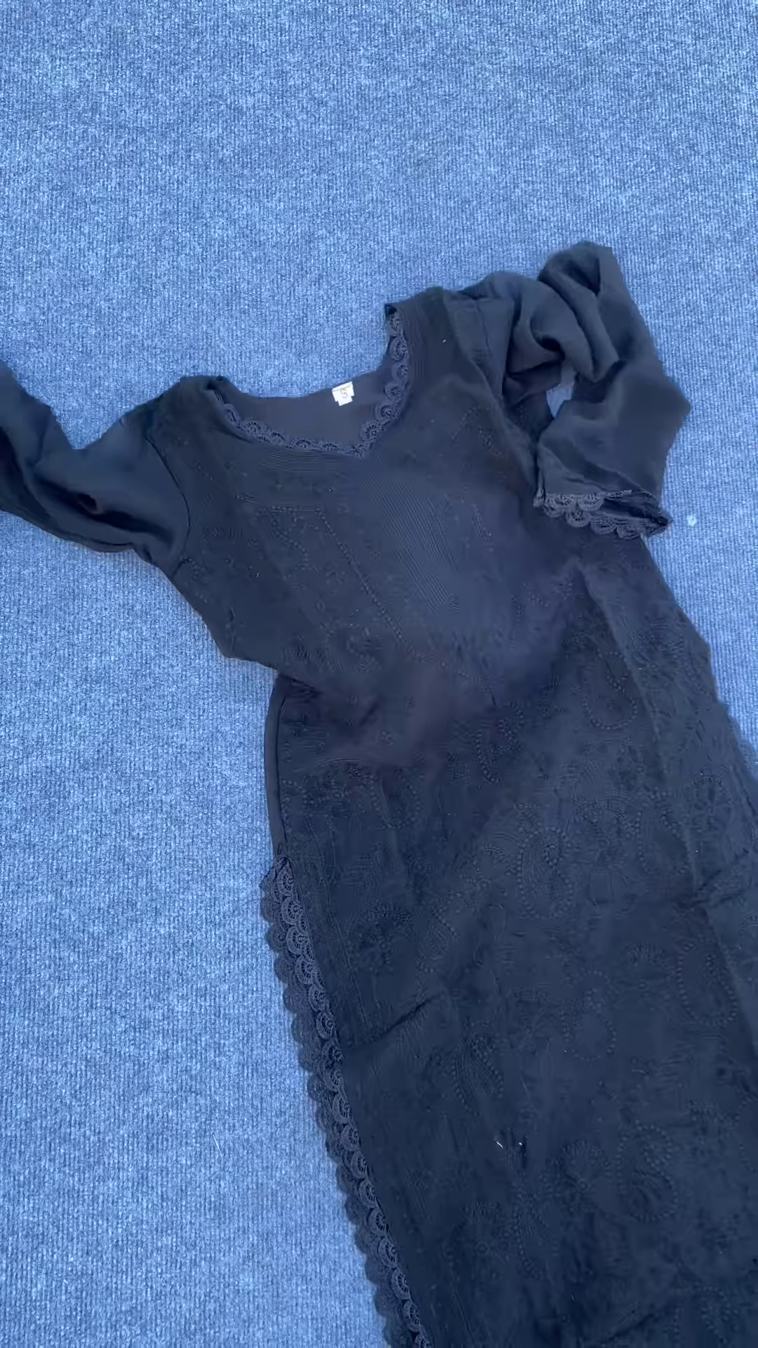 The set is laid out on a textured dark gray or blue surface, providing a contrasting backdrop that highlights the intricate white embroidery and lace detailing. The overall impression is one of timeless elegance, delicate craftsmanship, and serene beauty, making it a perfect choice for special occasions or elegant everyday wear, especially in warmer climates. The lightweight Georgette fabric and the intricate embroidery create a sophisticated and graceful ensemble.