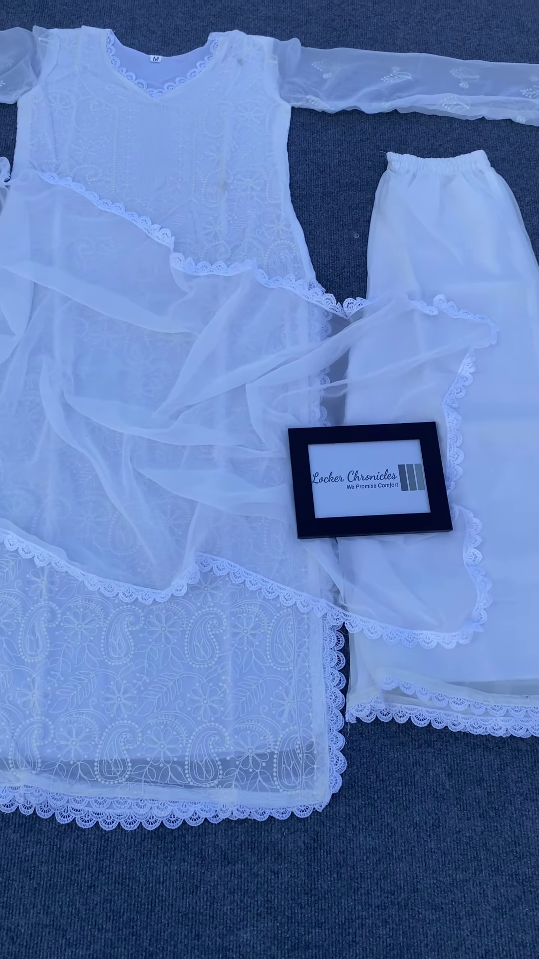 A small, framed card with the text “Locker Chronicles” is placed on the dupatta, indicating the brand or source of the garment.