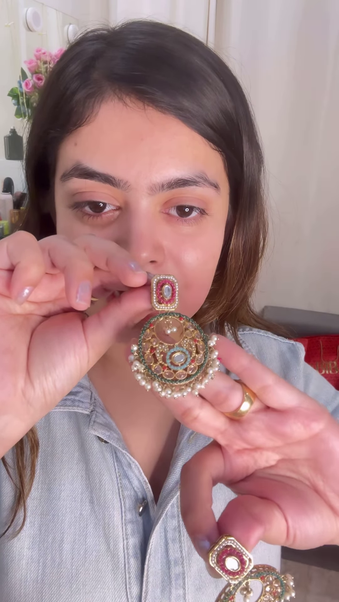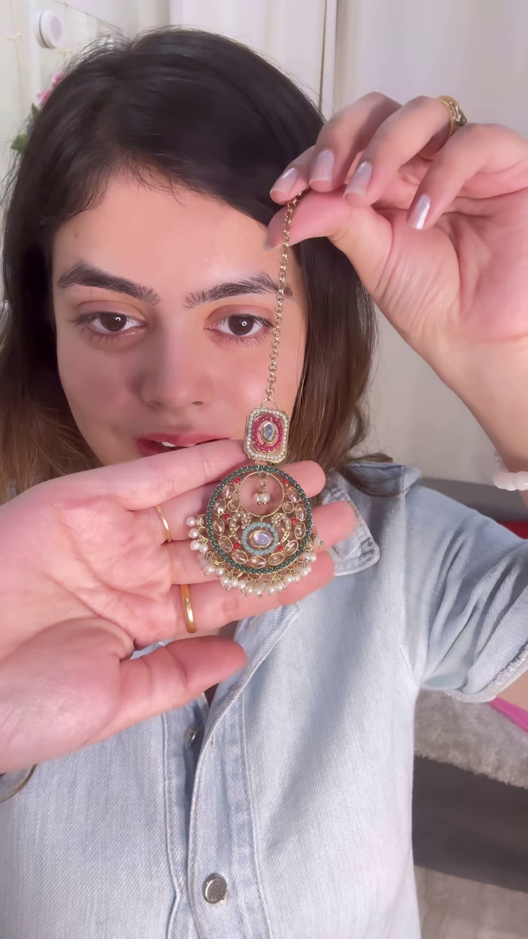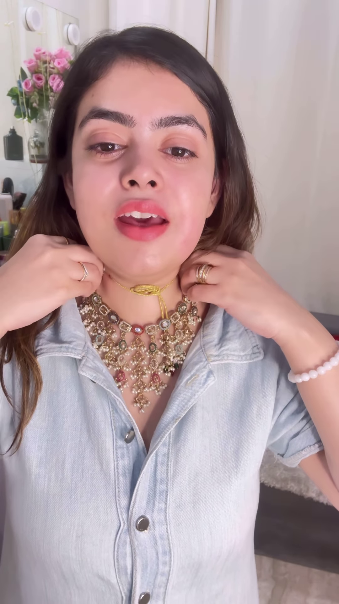 The woman presenting the necklace has a natural makeup look, ensuring that the focus remains on the intricate beauty of the jewelry. She is wearing a light blue denim shirt, which provides a casual contrast to the ornate necklace, likely highlighting its suitability for special events where a touch of traditional grandeur is desired.