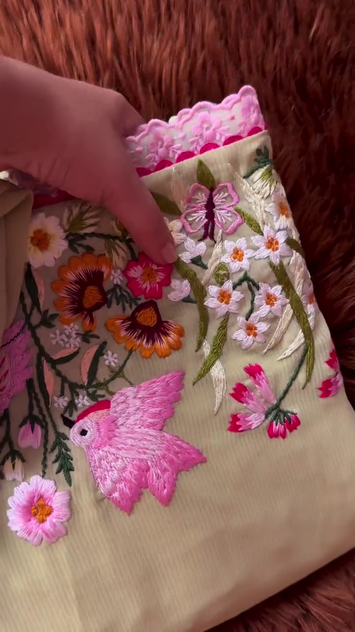 🪻 Motifs: Pink birds, butterflies, orange & maroon flowers, and white daisies