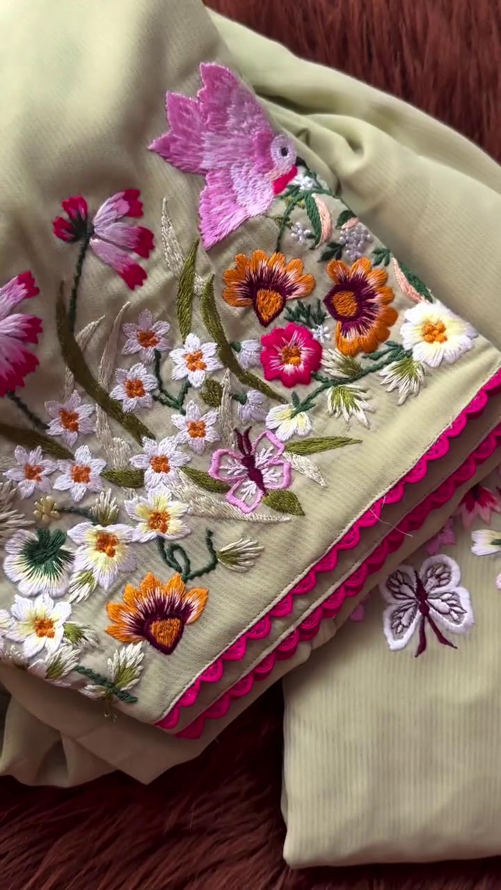 This stunning olive green fabric features rich, multicolor floral embroidery with charming motifs of birds, butterflies, and daisies, making it perfect for creating elegant suits, kurtis, or festive outfits. Accented with a hot pink scalloped lace border, this fabric blends nature-inspired charm with vibrant craftsmanship.