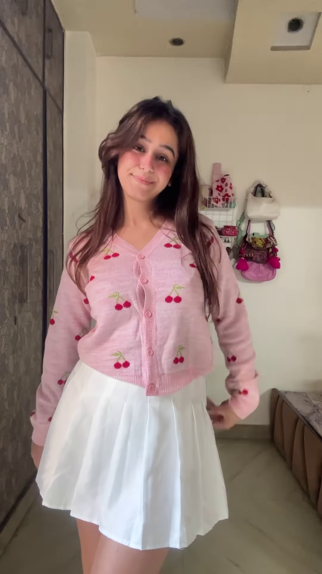 - ๐ Pink Cherry: Soft pink cardigan with scattered cherry embroidery + paired with white pleated skirt
