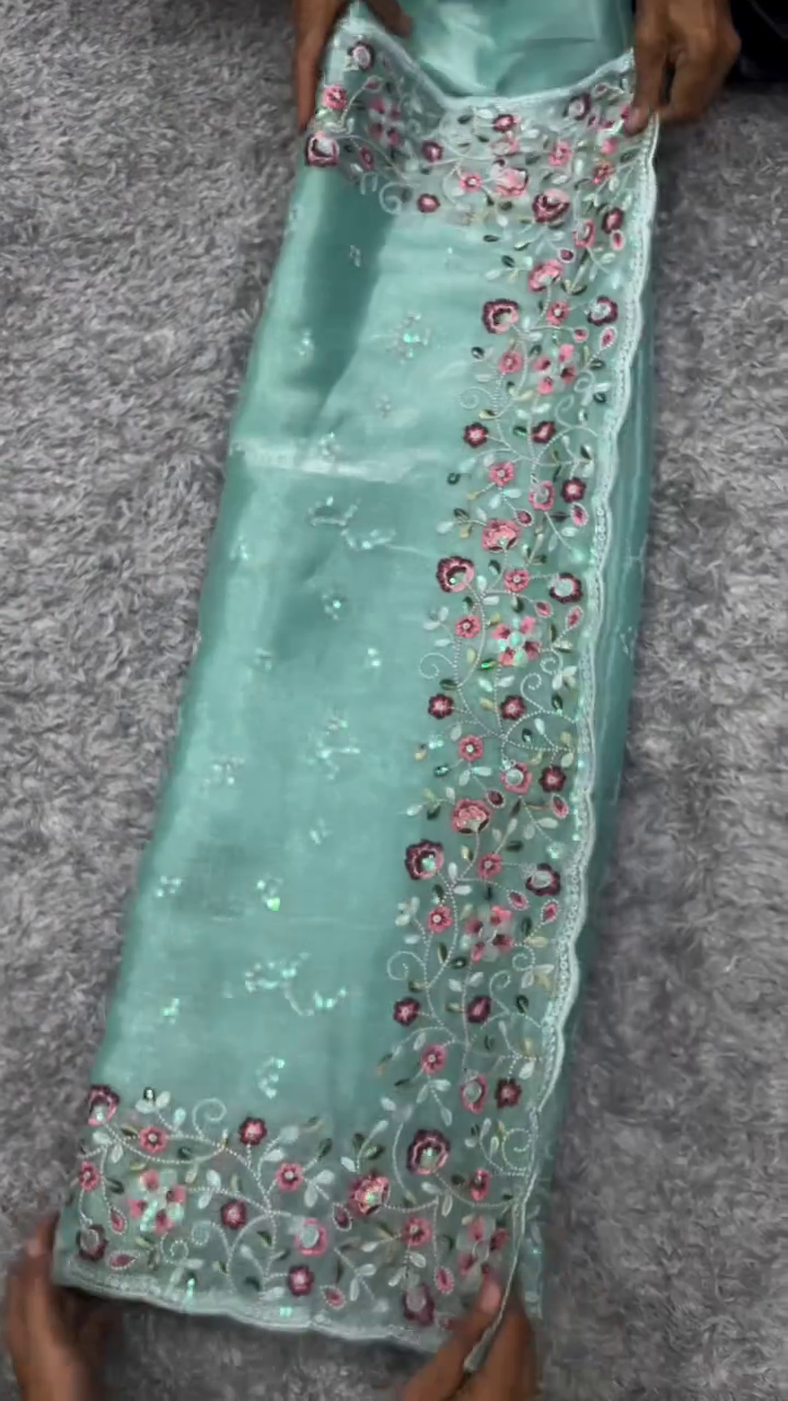 This organza fabric is ideal for creating a range of high-end ethnic wear, from a voluminous saree “palla” to a designer Anarkali kurta or a sophisticated evening dupatta. The sheer nature of the organza allows for beautiful layering over solid fabrics, creating a play of light and shadow that is very popular in modern Indian fashion. The embroidery is executed with a high stitch count, ensuring a raised, premium texture that feels luxurious to the touch. The green and pink color combination against the grey background is a fresh and stylish take on traditional floral motifs.