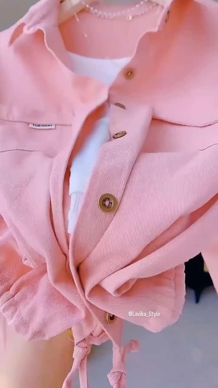 The set includes a lightweight, short jacket and a coordinating inner top, creating a cohesive and polished look. The jacket is the standout piece, crafted from a smooth, soft fabric in a beautiful pastel shade of blush pink. This delicate color is both feminine and on-trend, making it a perfect choice for spring and summer. The jacket features a classic shirt-style collar and a full-button front, giving it a timeless and clean silhouette. What makes this piece unique is its cropped and cinched hemline, which is adjustable with a drawstring. This detail adds a modern, sporty touch and allows you to customize the fit, creating a flattering, cinched waist effect. It also gives the jacket a slightly playful and youthful vibe.