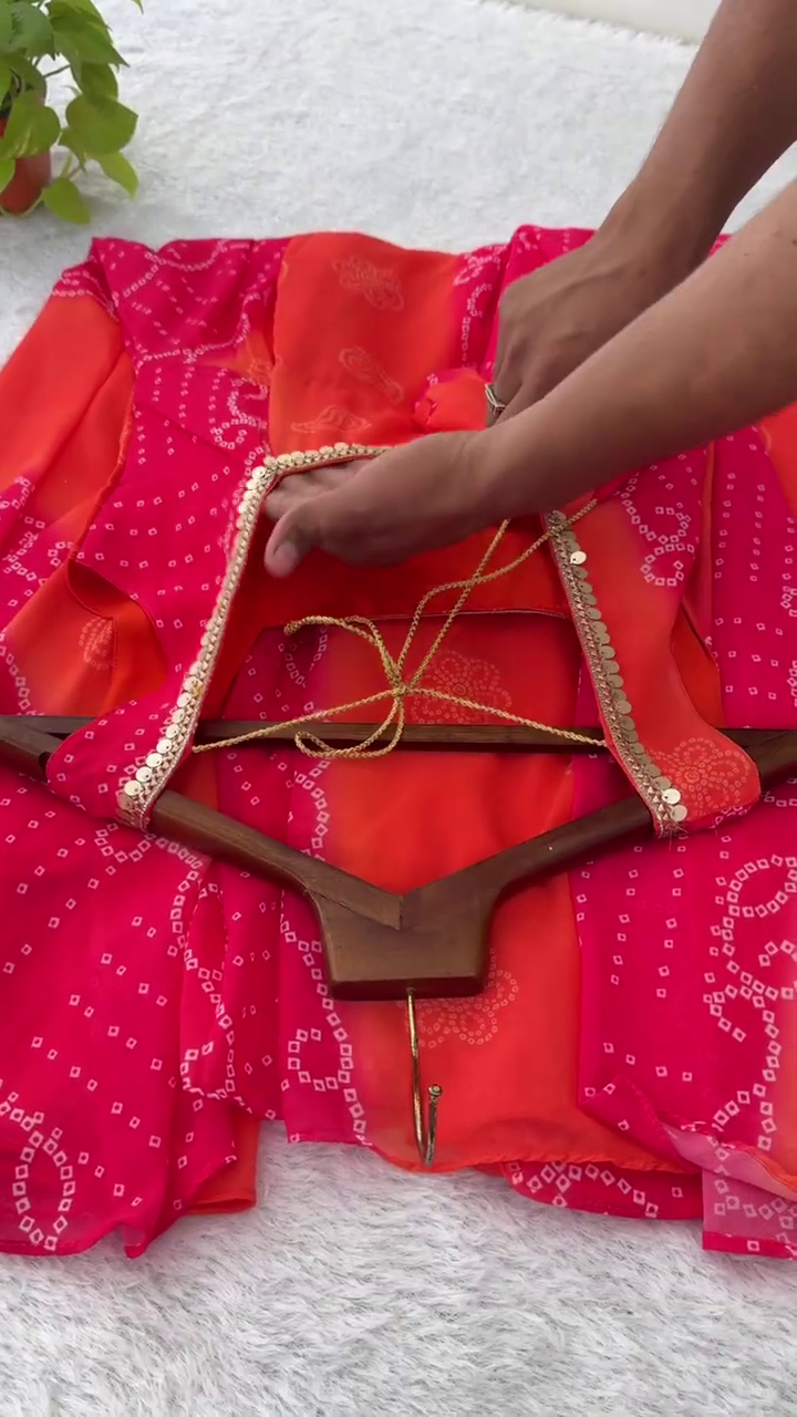 + Free ShippingRadiate vibrant festive energy with this striking pink and orange designer Anarkali. Combining traditional tie-dye artistry with contemporary boutique finishes, this ensemble features a multi-tonal palette that captures the essence of a traditional “Bandhani” aesthetic, making it an ideal choice for Mehendi ceremonies, Haldi rituals, and daytime festive celebrations.