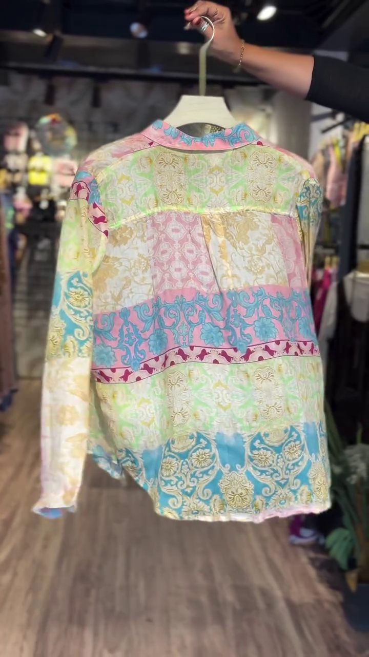 + Free ShippingTurn heads this season with this vibrant pastel patchwork shirt, layered over a simple baby blue camisole. With its sheer fabric and boho-style mixed prints, this shirt is perfect for adding a pop of color and flair to any outfit.