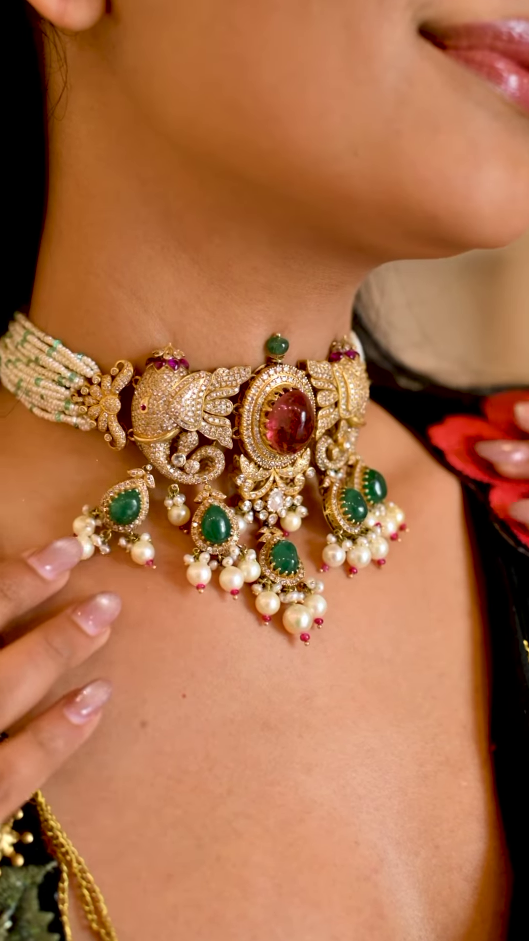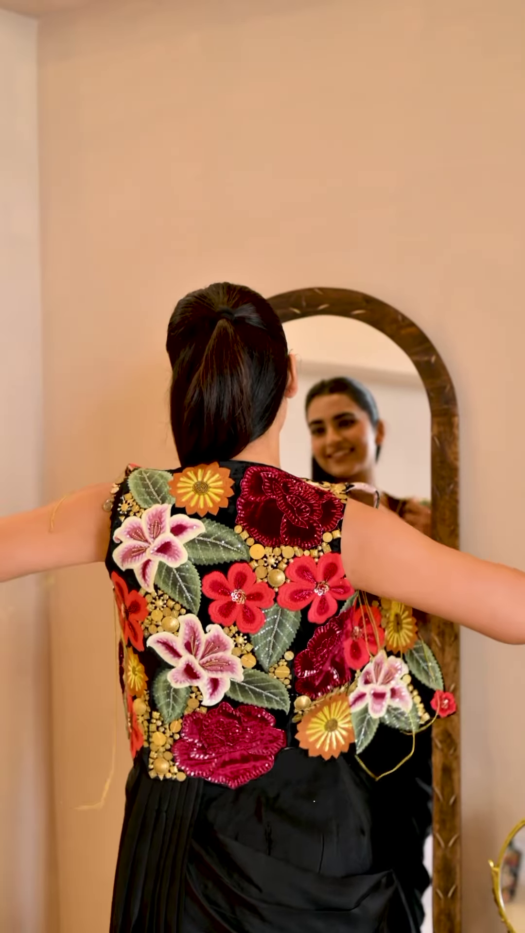 The saree features a rich black base enhanced by gold detailing across the borders and pleats. The embellishments are subtle yet striking, forming a shimmering trail that adds depth and festive charm to the garment. The pleated draping showcases the saree’s flow and structure, making it ideal for motion-filled visuals, bridal reels, or showroom walk-ins.
