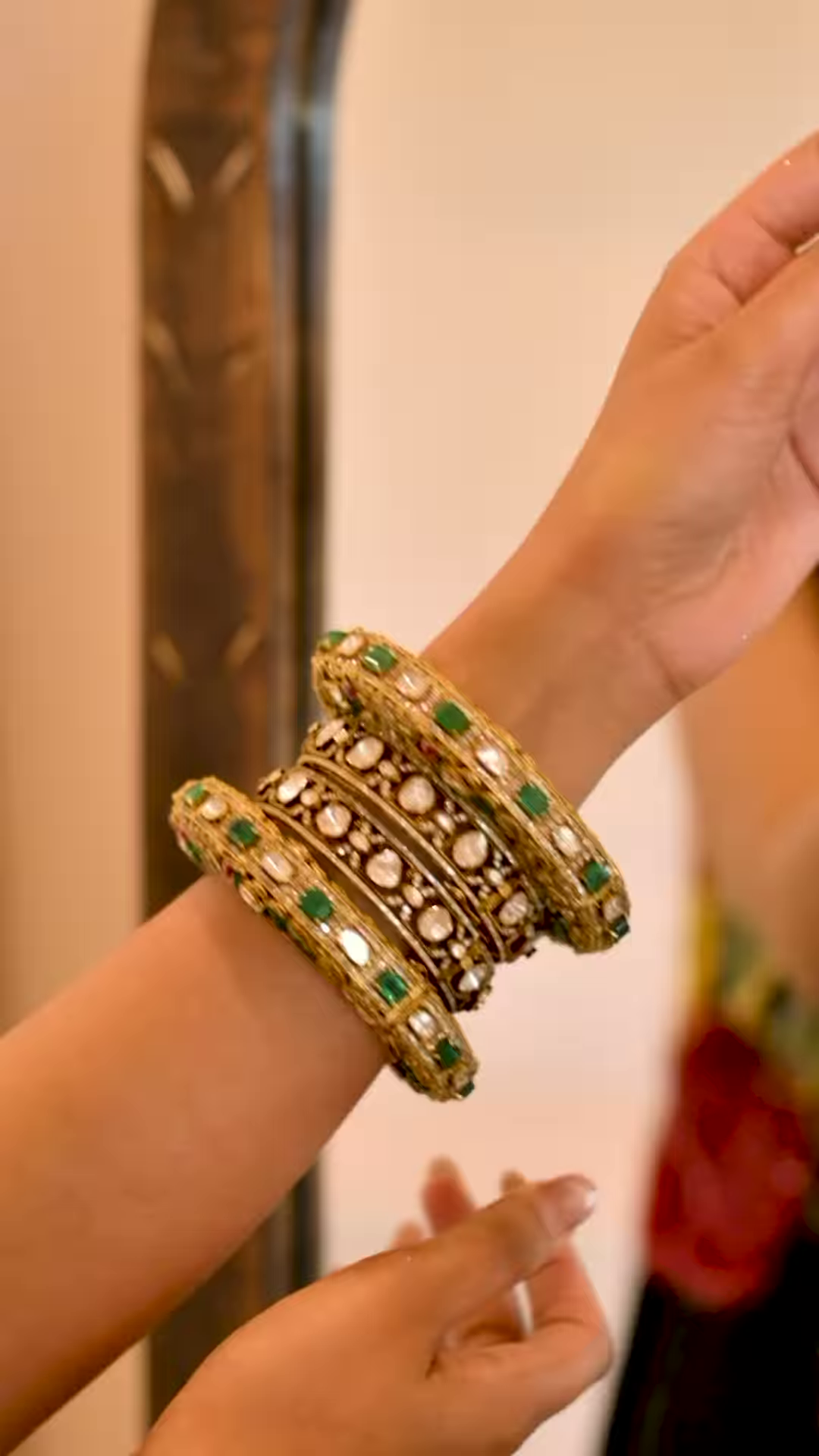 The person wearing the saree adds to the styling narrative with a gold bracelet on the left wrist—introducing accessory inspiration and reinforcing the ethnic theme. The bracelet’s design complements the saree’s embellishments, suggesting pairing options like gold jhumkas, bangles, or clutch bags for complete festive styling.