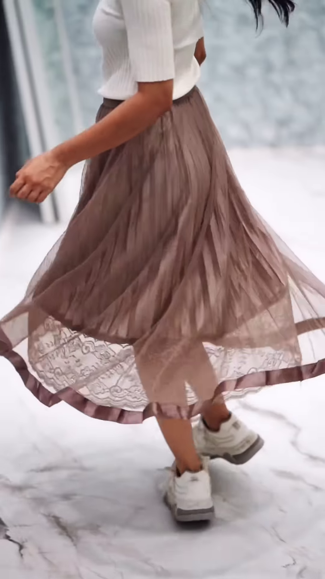 Styling suggestions include layered necklaces, sling bags, and dainty gold rings for a trendy streetwear polish. Add a denim jacket or cardigan for warmth and texture, or swap the skirt for jeans to extend the wardrobe possibilities.