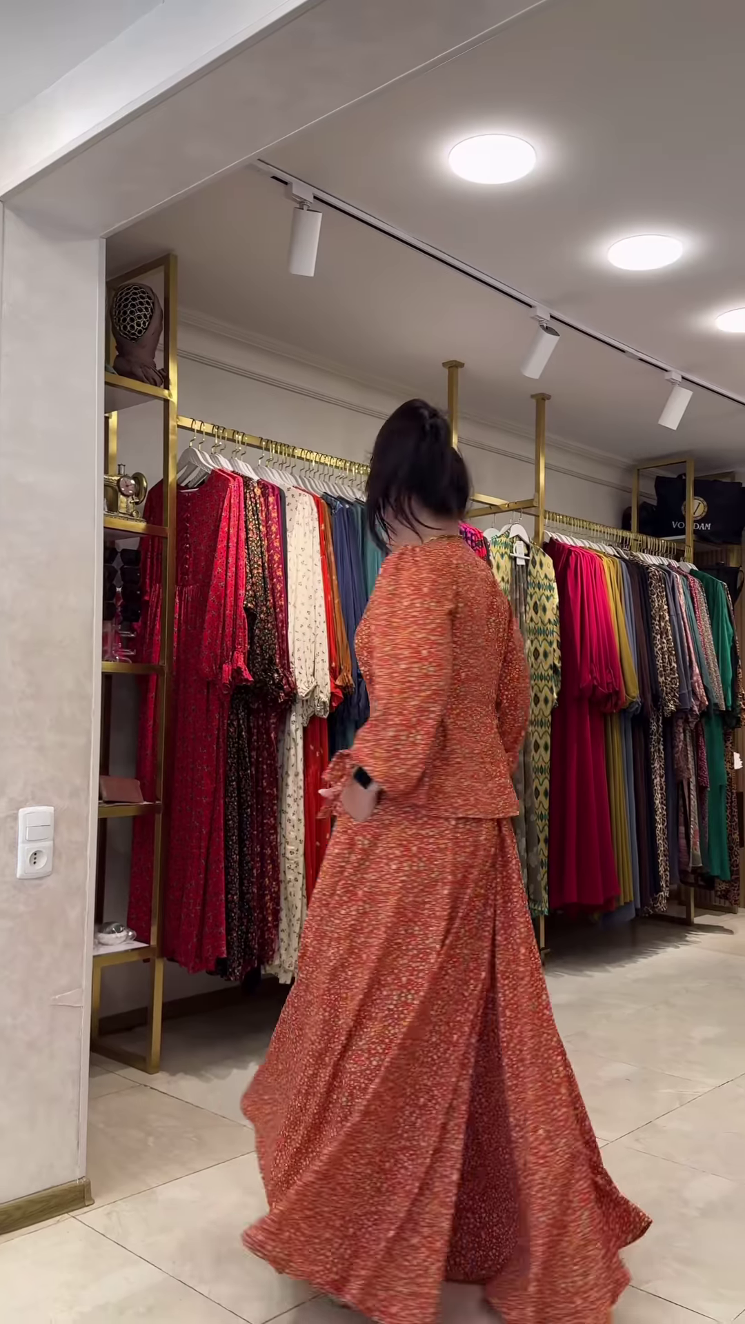 The backdrop of the store setting—gold shelving, ambient lighting, and colorful garment racks—suggests boutique relevance, positioning the outfit perfectly for display and storytelling. Pair the ensemble with oxidized jewelry, a structured tote, or open-toe flats to personalize the look. Add a soft scarf or minimal makeup for a daytime event or swap in metallic bangles and bold earrings for evening elegance.